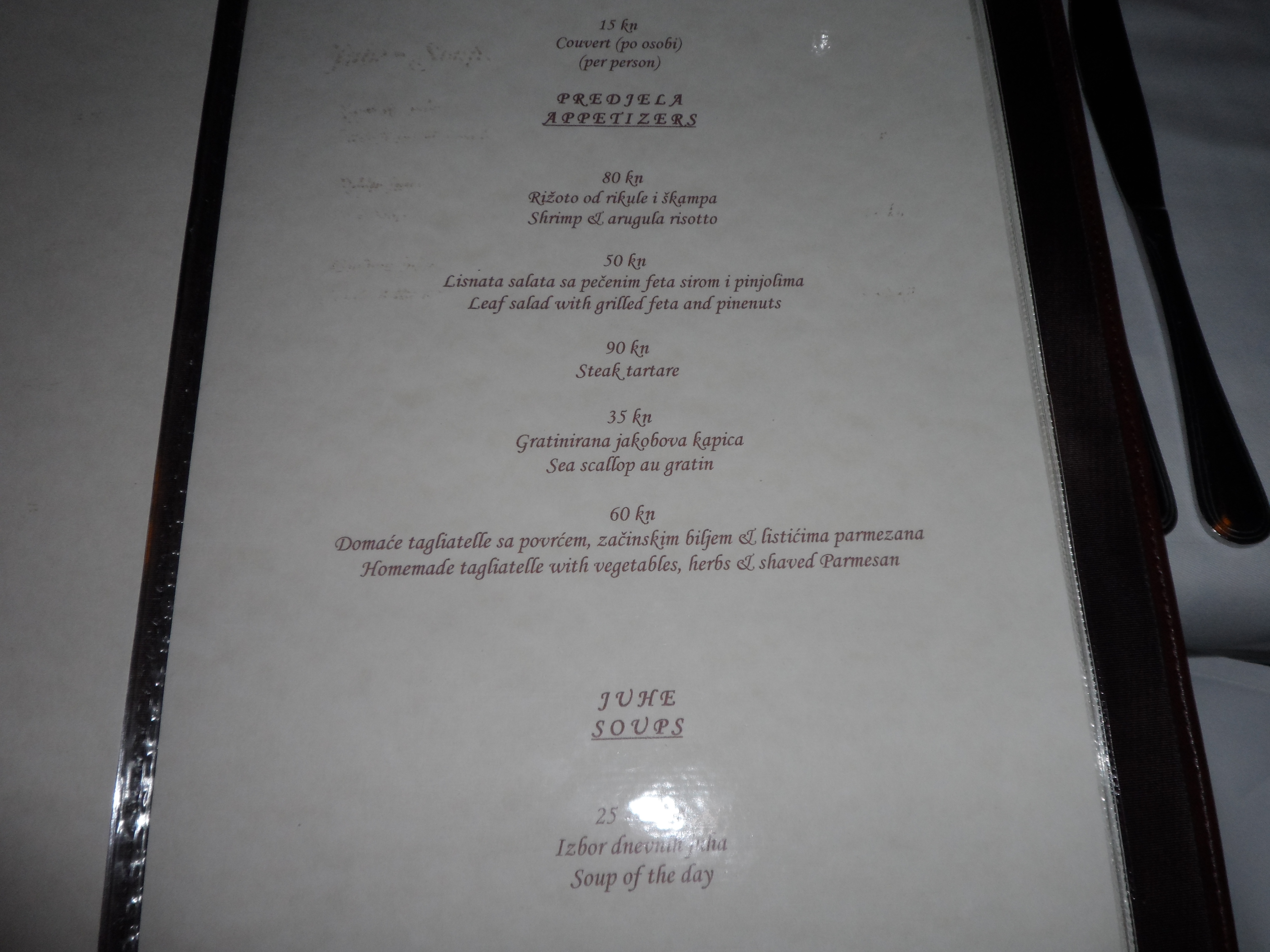 During my last night in Zagreb I was walking around the city after visiting the museum of broken relationships. This museum by the way, is very funny and I can recommend it for anyone who likes a modern museum with a modern theme. Just walking down the hill the first restaurant I bumped into was this Pod Grickim Topom (http://www.restoran-pod-grickim-topom.hr/) luckily I don’t need to pronounce it because I really don’t have a clue… After seeing the front door from a distance I almost turned around because it looked like just the next traditional Croatian grill restaurant, only when I came closer I noticed the very good looking menu. And since I was looking for some different food it appealed to me right away!