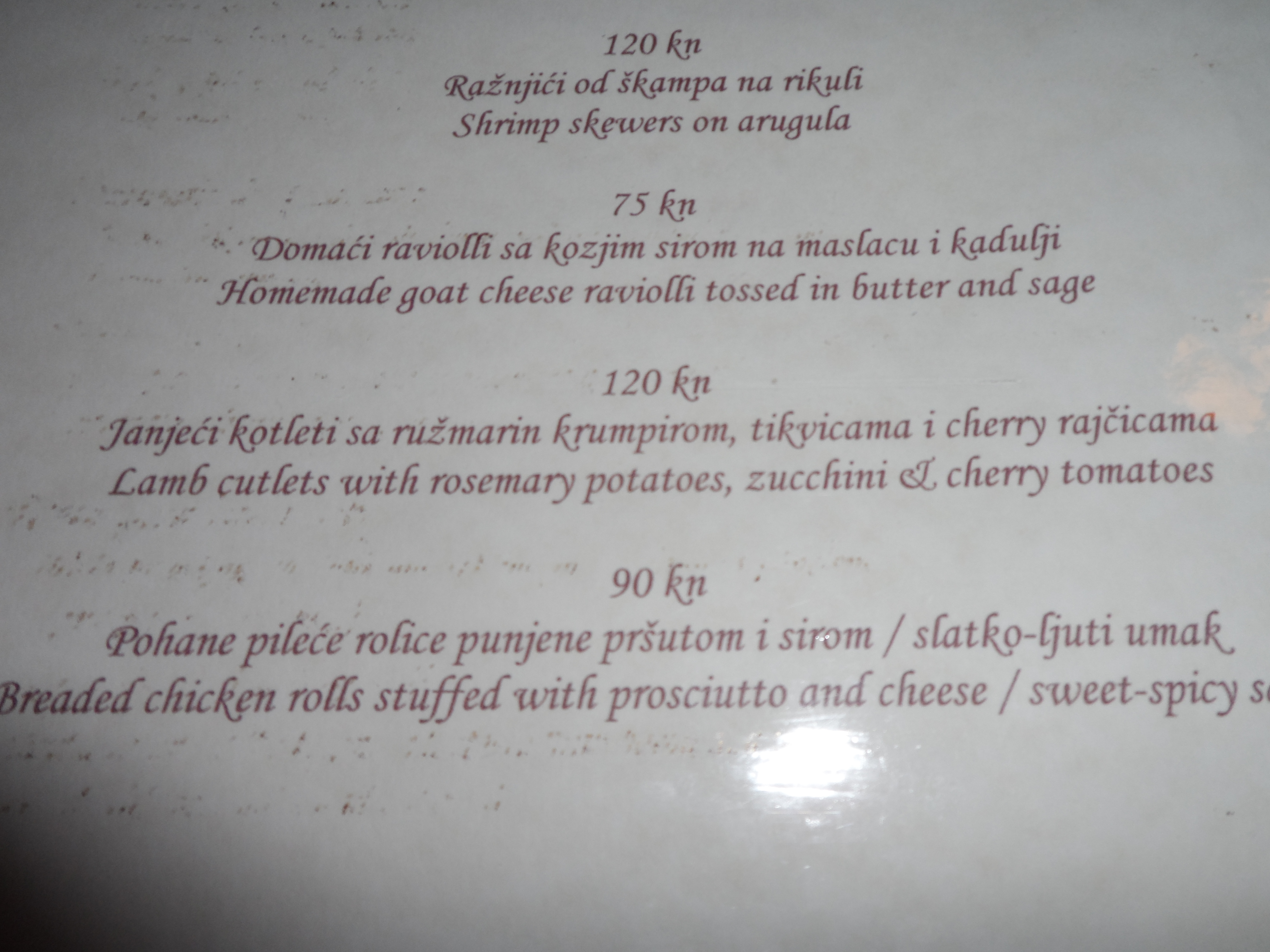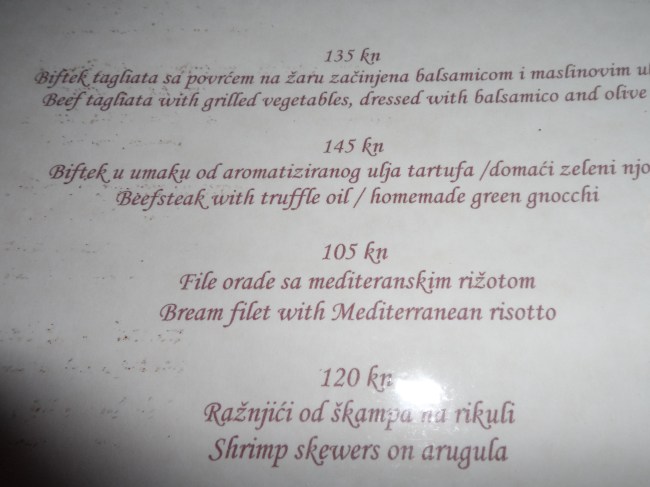 Unfortunately the quality wasn’t that good, and at a price of around €11 you expect more, for Croatian standard, that’s a lot of money! Ok, maybe it was pretty dumb to order this dish at 38 degrees but when I order a steak tartare, I expect it to be cut by hand and not put into the blender…. which made it look like minced meat. The taste was good it just was the structure and the temperature that destroyed it, so I was regretting not to have chosen some of the dishes I saw on other plates. Good thing was the local rose wine, WOW what a bomb. I asked for the house wine and this was the suggestion wine which luckily was available by the glass. Since the bottle was not on the table I cannot repeat it’s name, it sounded like hrvatsikalerekerskert rose wine…. When I find out what it is I will put it on here.