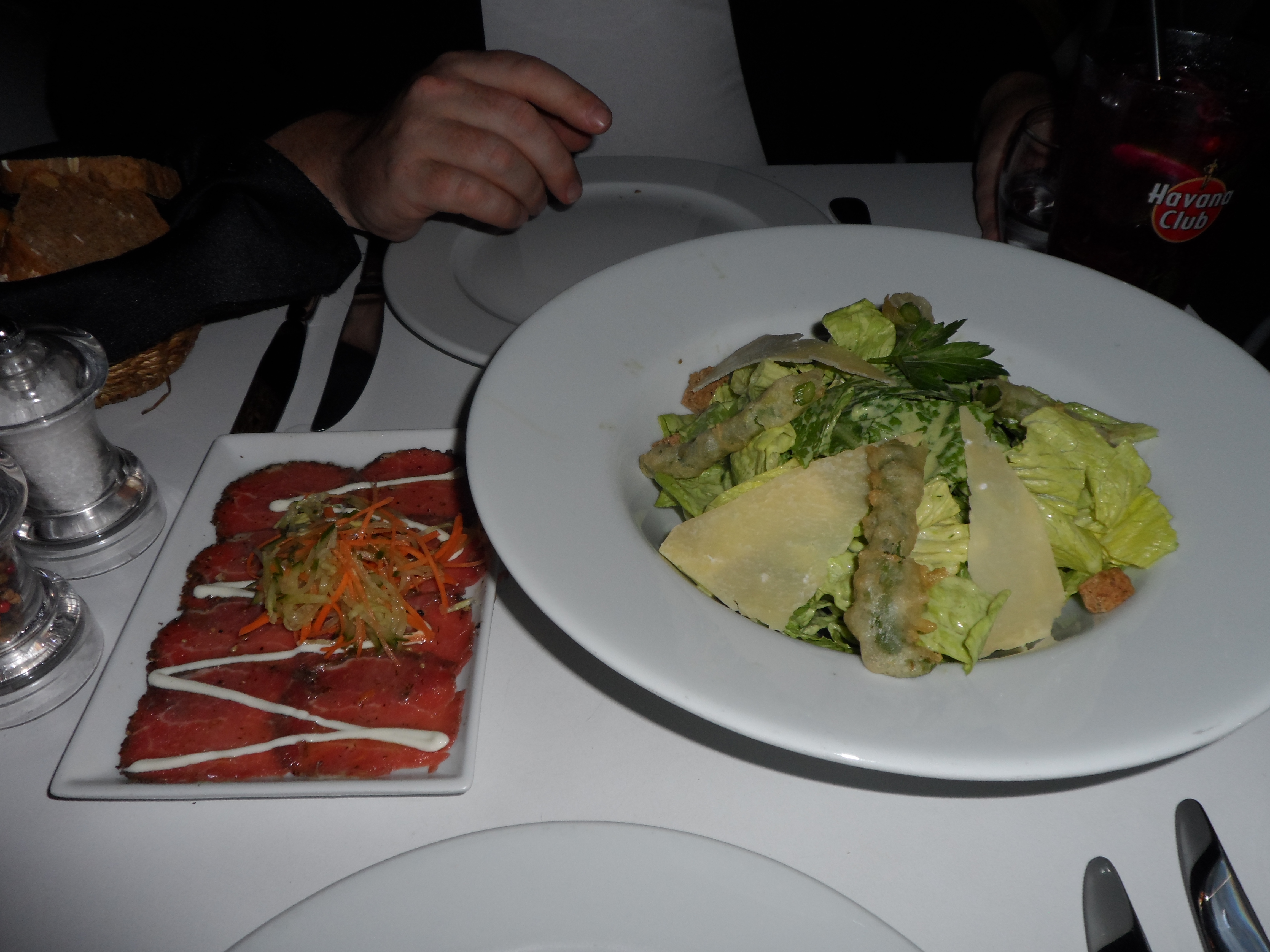 As a starter (and it was a tough decision just as for the main) we ordered a special type of Caesar Salad and some succulent beef carpaccio. We could of course also have chosen for things such as slow roasted cherry duck or potato wrapped prawn or melon soup with cheese croquets (Damn I need to go back…..)