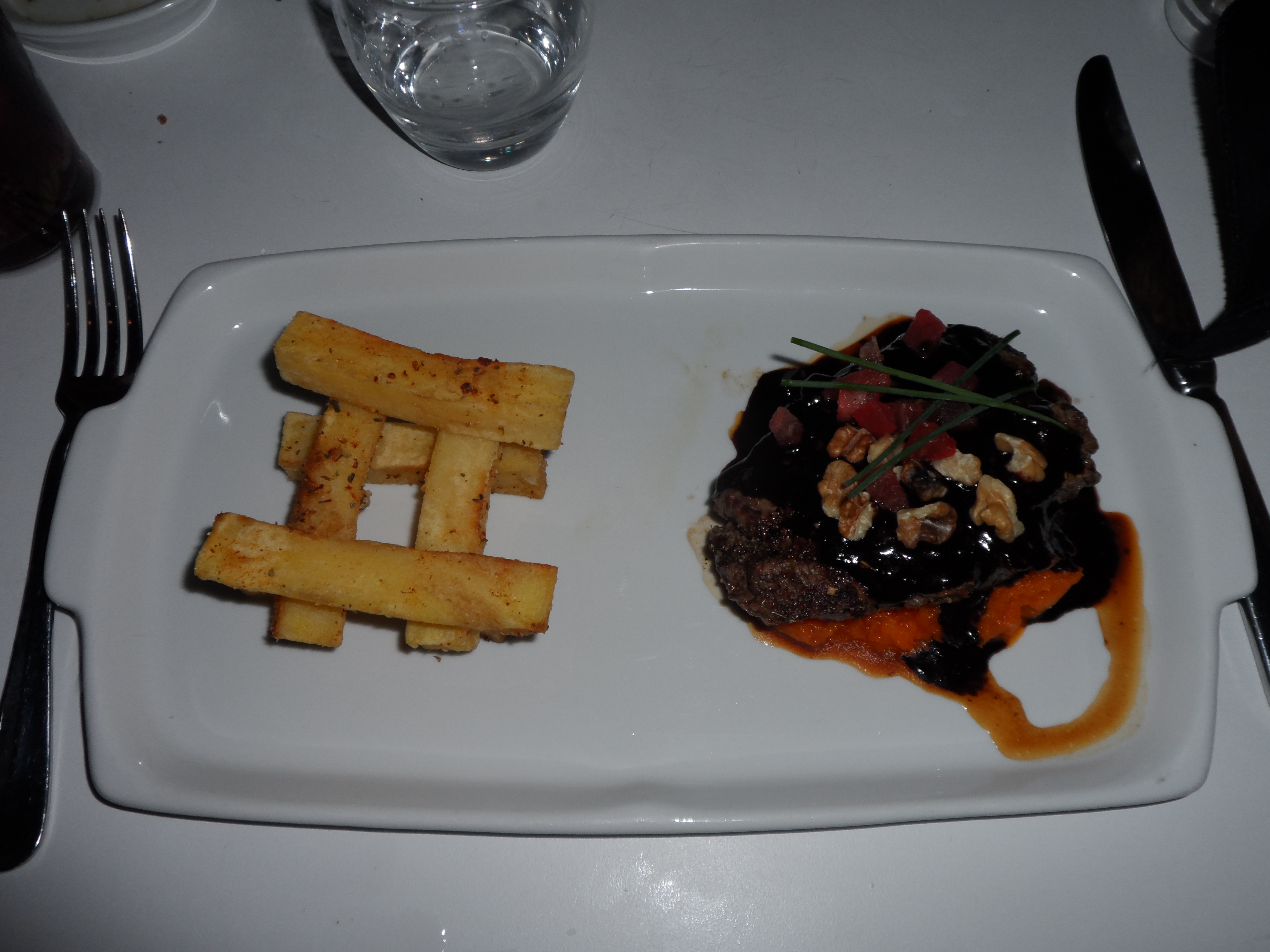 But what you can not see is the quality of both dishes, I will only talk about mine because the other one was finished and they did not want to share, it was that good… mine was perfect as well, same perfect meat but together with the dark spicy chili chocolate sauce and the bitter walnuts on top it was sooooooo goooooood, and then the creamy buttery orange cinnamon puree….. just found a piece of heaven…. and the combination of it all, just one of the best dishes ever. Only point or critisism, what are these potatoes doing there? not an asset at all, could have done without them…