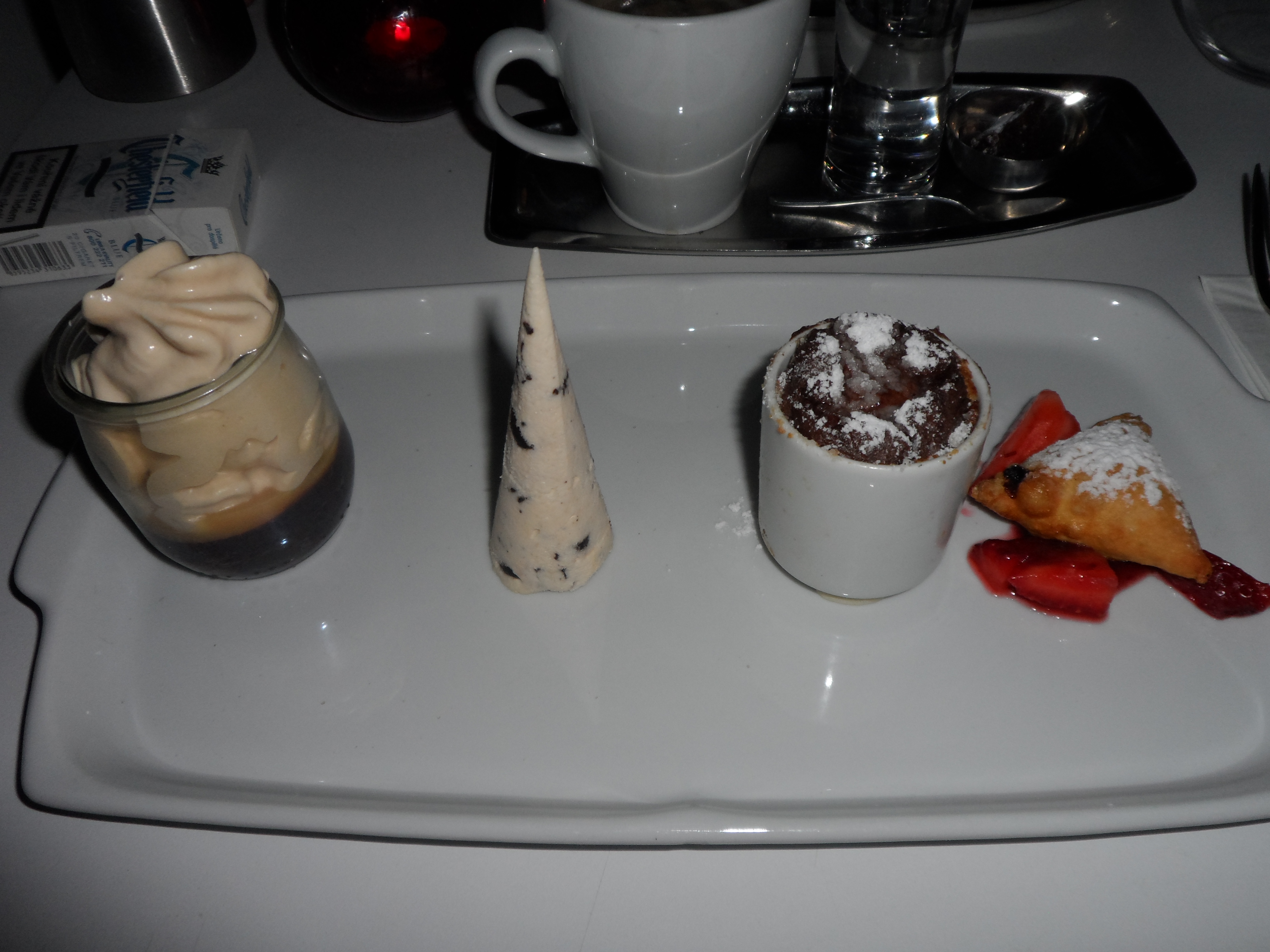 The death by chocolate was so good and heavy with a perfect light and fluffy soufflé, a frozen stracciatella cone with mint inside, creamy cappucino chocolate cup and a strawberry chocolate mix, it was perfect. The other was even better with a sweet pastry base filled with a caramel custard, topped with grilled popcorn for the needed “brulee” crunch. Some caramel ice on top and sweet apple sauce on the bottom, all in 1 bite made the best combination of texture and taste.