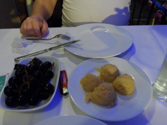 After this I was surprised by a complimentary dessert. Something new to me and totally my thing. Fresh almond dough with sugar (like the Dutch amandelspijs) but scooped in a ball with fresh grapes and Raki…. Good way to finish!