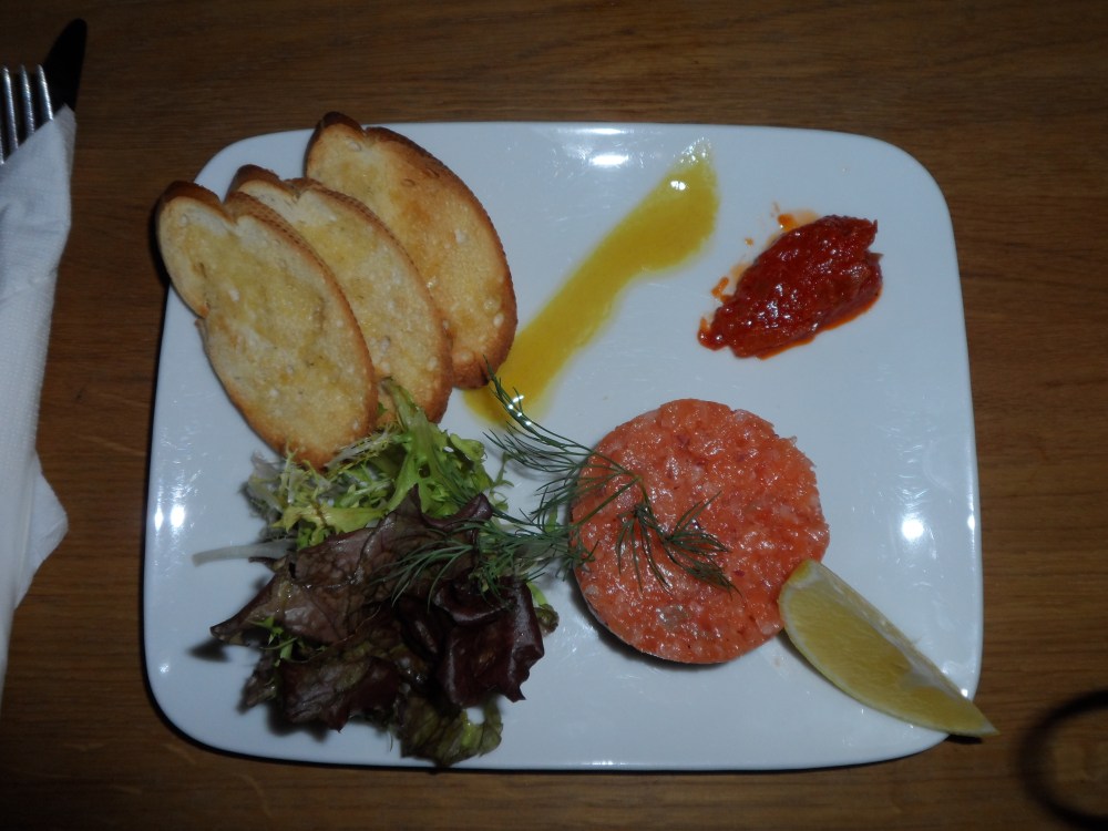 I was still on my diet, only not as strict as I was a few weeks ago (meaning that I tell myself to eat careful and less and meanwhile live the same life as I did before….). But this made me decide to go with salmon to start and then the moose stew to finish, and just 1 glass of wine in stead of 2…