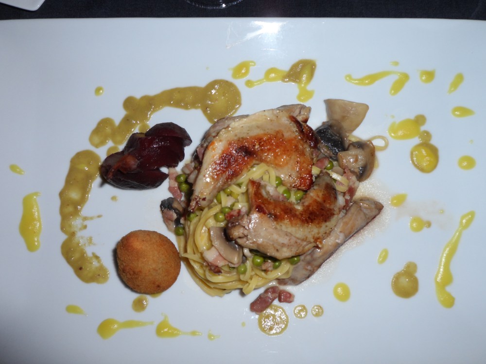 Mine was the partridge alla Boscaiola. Heavy sauce with the bacon / pancetta – peas – cream sauce together with 4 big pieces of the partridge, 2 legs and 2 fillets and then the fresh linguine, some pumpkin sauce (different then the starter), a second sauce that was hard to clarify, sweet and salty with a taste of saffron. A lovely sweet cooked pear with cinnamon and red wine and some deep fried battered risotto ball. Big heavy dish but good again, they never really disappoint me here, except the partridge was slightly overcooked and just to dry for me…