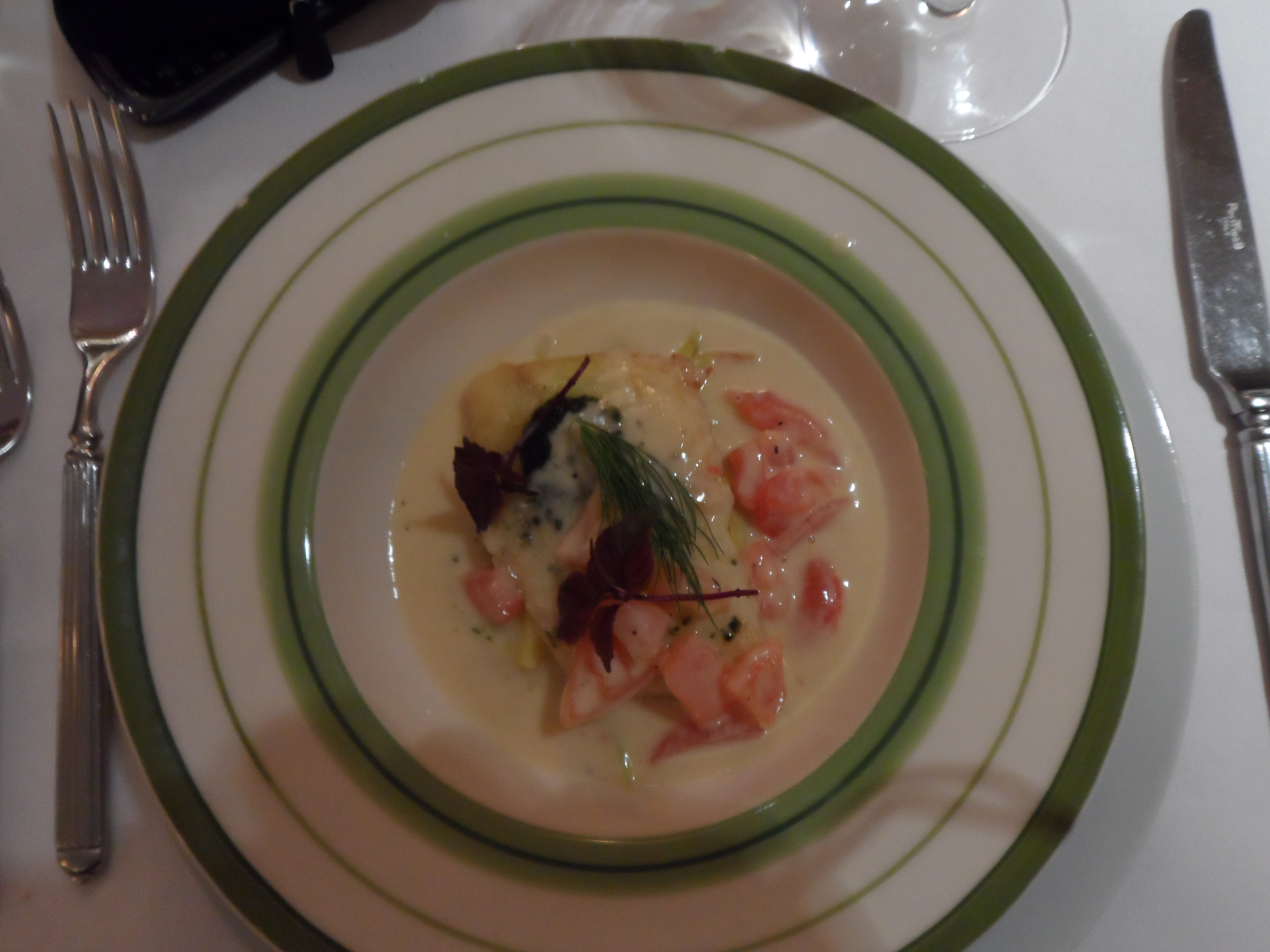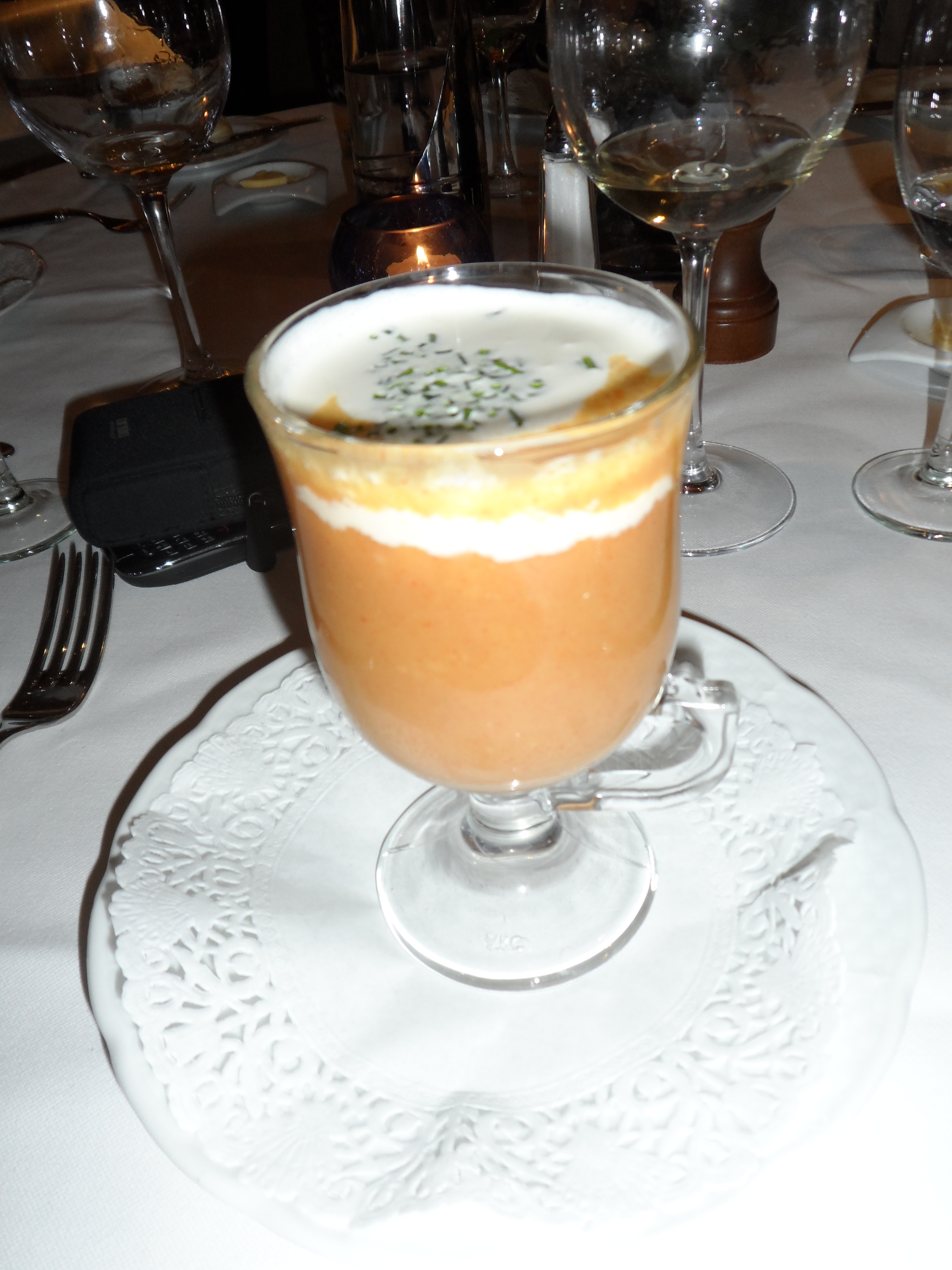 So this far the company was good, the drinks and atmosphere were good, just the cooking was not at the same level so far. Then we had a nice Bisque as an ” in-between” dish. It was presented in a original way as an Irish coffee with fresh cream on top.