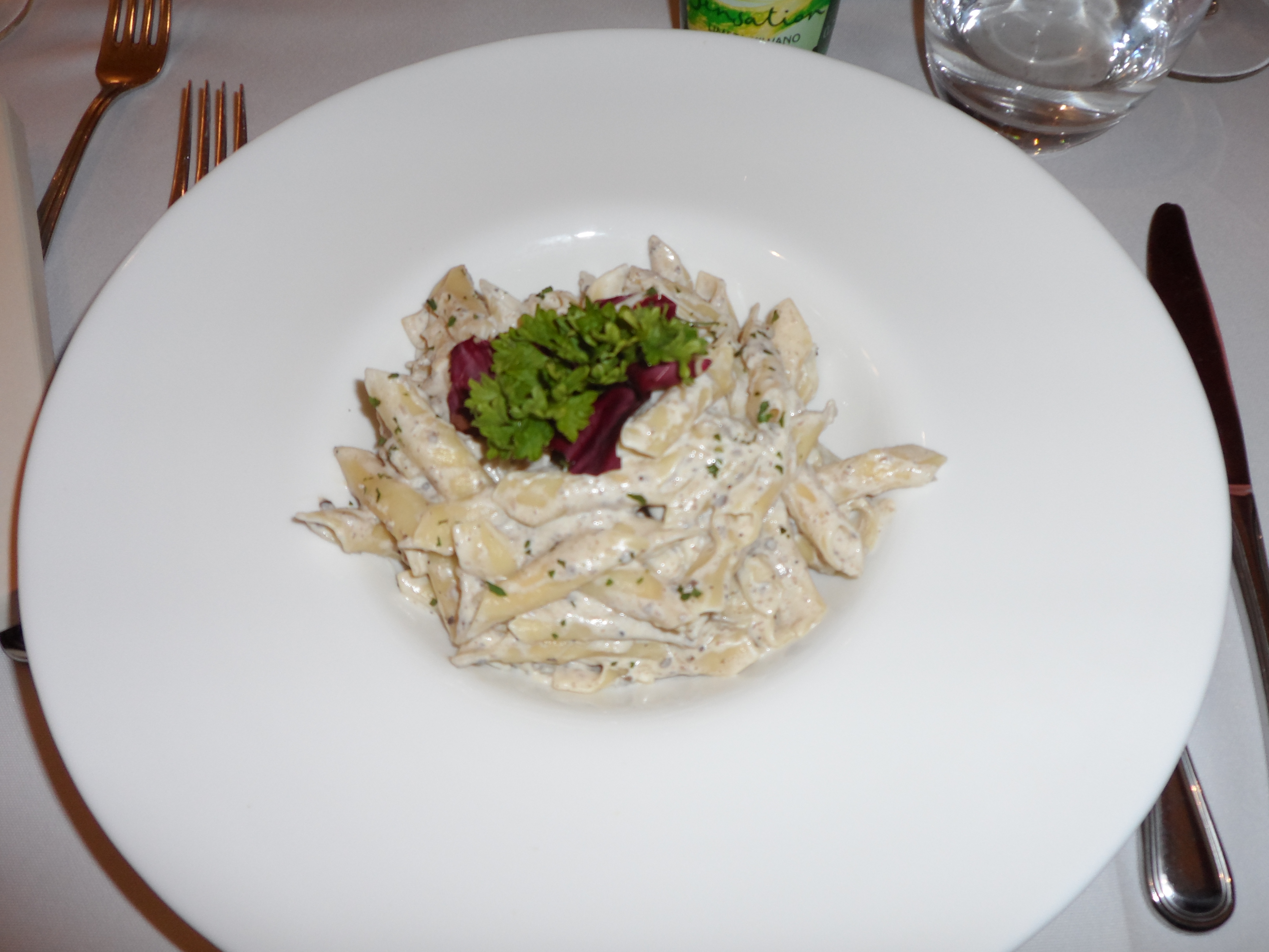 And it looked and mst of all smelled perfect, all my faith back restored again, ready to dive in! The first bite was half-warm, too bad. Second bite was hot as hell… so I’m guessing microwaved pasta…??? So it needed a hustle and then at least the temperature was okay. The taste was of pure Truffle oil which is good but a bit harsh at some times. The overall flavor was very sad, just discuissed by the Truffle oil. So I asked Lurch to bring me some fresh pepper, Oops, mistake. It not only took him 6 minutes (?!) I heard yelling coming from the kitchen, maybe they cook without salt and pepper here? He rushed to my table and turned the mill strongly to see fresh salt coming out on my plate….AAARRGGGHHH how to ruin a terrible dish? Like that! 3 minutes after this the pepper came, the pasta was cold, the taste horrible and the hunger was growing.