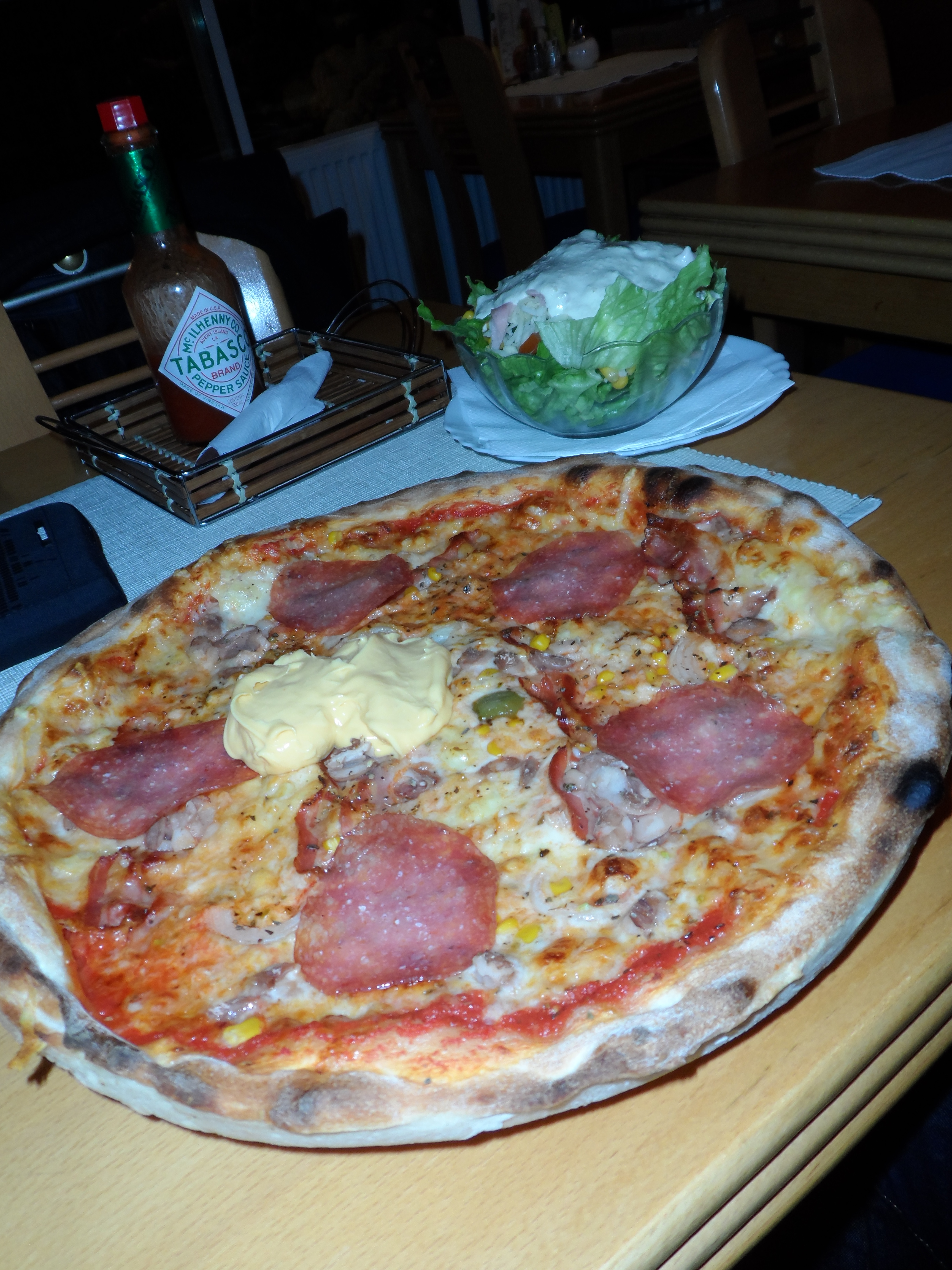 I was so hungry I ordered the biggest pizza they had on the menu, it was a Mexican one, which is totally against my principals. Because I think when you are in an Italian restaurant you should eat real Italian food. I don’t know what idiot started to put all crazy things on a pizza, it does not belong there….