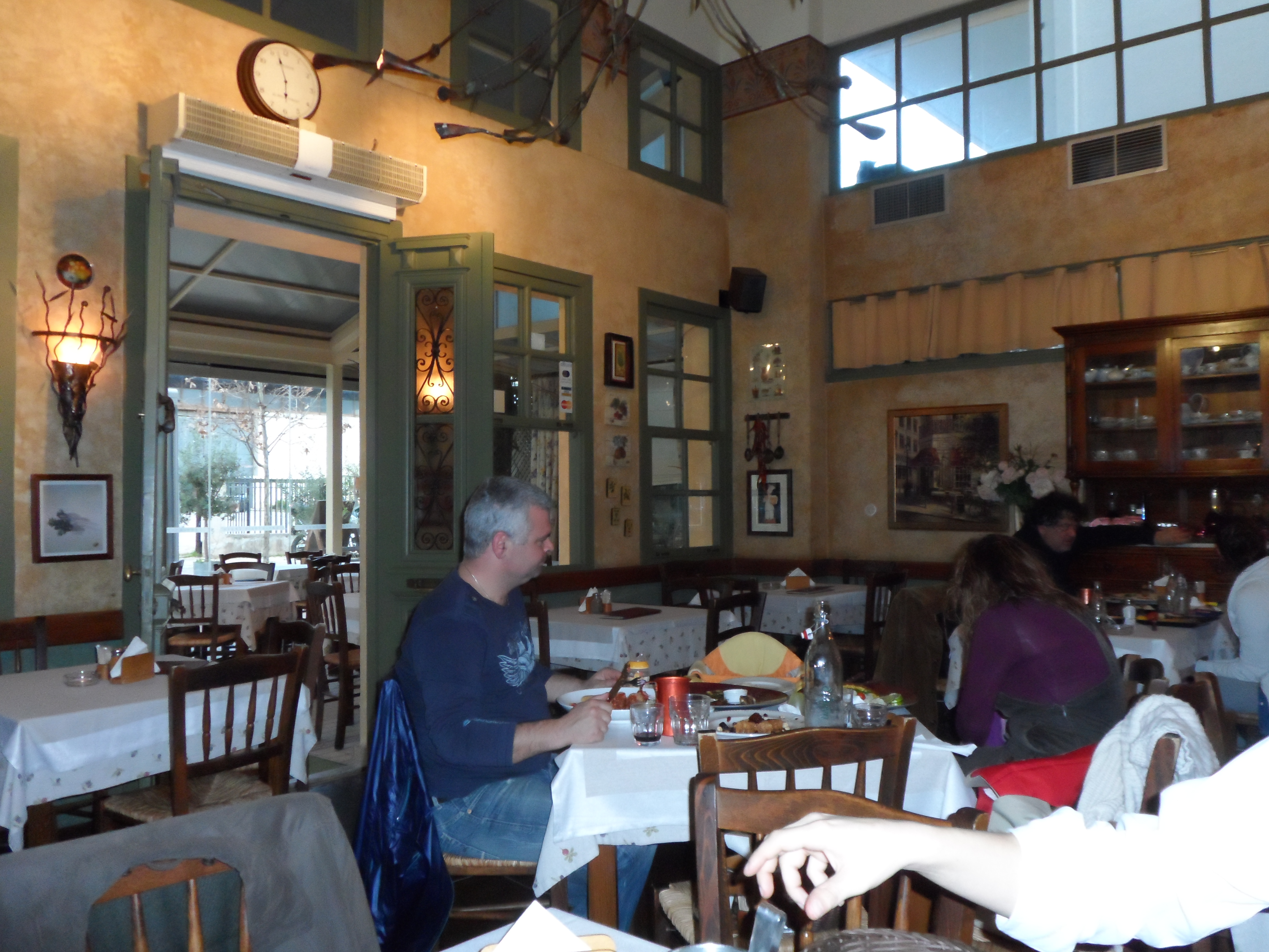 We had a choice of sitting inside our outside in a glass veranda. And since they are still allowed to smoke over here one place is for smokers and the other one is for non smokers, funny enough in Greece I always feel if everybody smokes so the non-smoking area was empty…