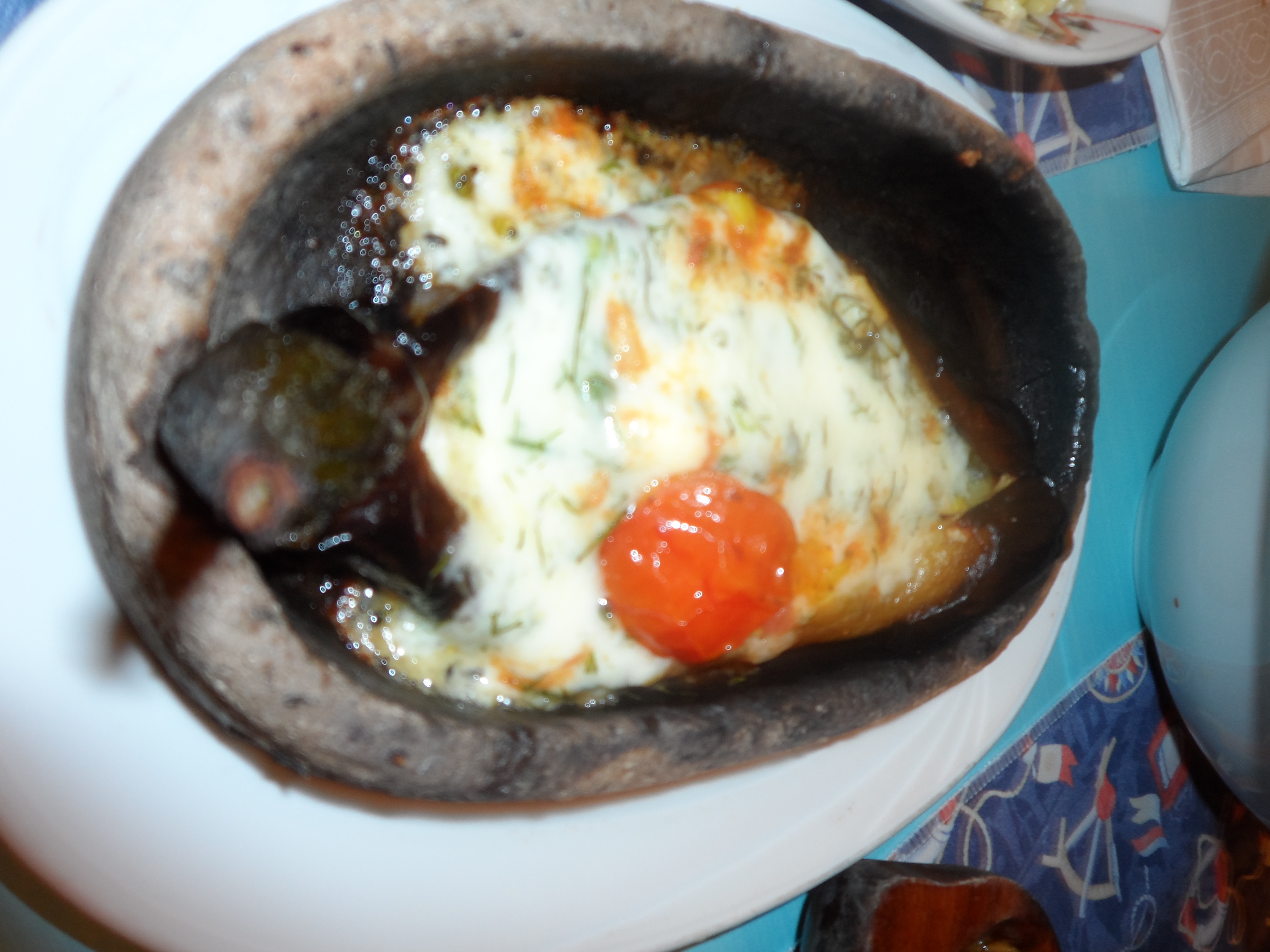 They started with 3 small dishes containing smoked salmon in a tomato sauce (heinz with sugar), not my personal favorite, but my business partner loved it, there was a bowl of mashed eggplant with cheepcheese and very good yoghurt with cheese and spicy spices, perfect o the Turkishbread! Next cam some other small plates (but more then enough) with opened eggplant and grilled cheese (Yummie!), fried Calamari (more Yummi), an incredible big seafoodsalad with krab (surimi so less points….) calamari, shrimps, corn and other toppings, very nice, then some spicy szzzzling shrimps and some more bread.