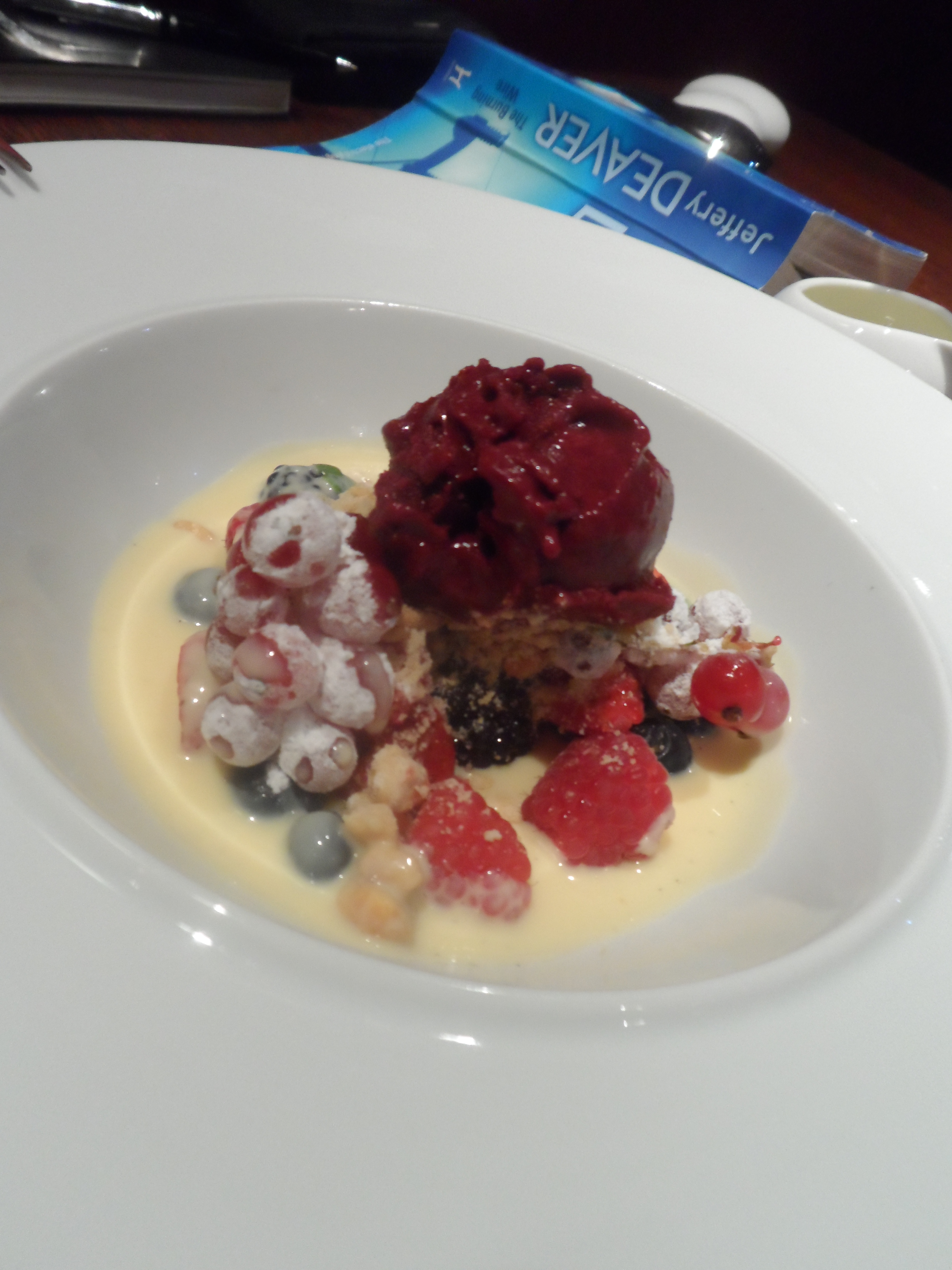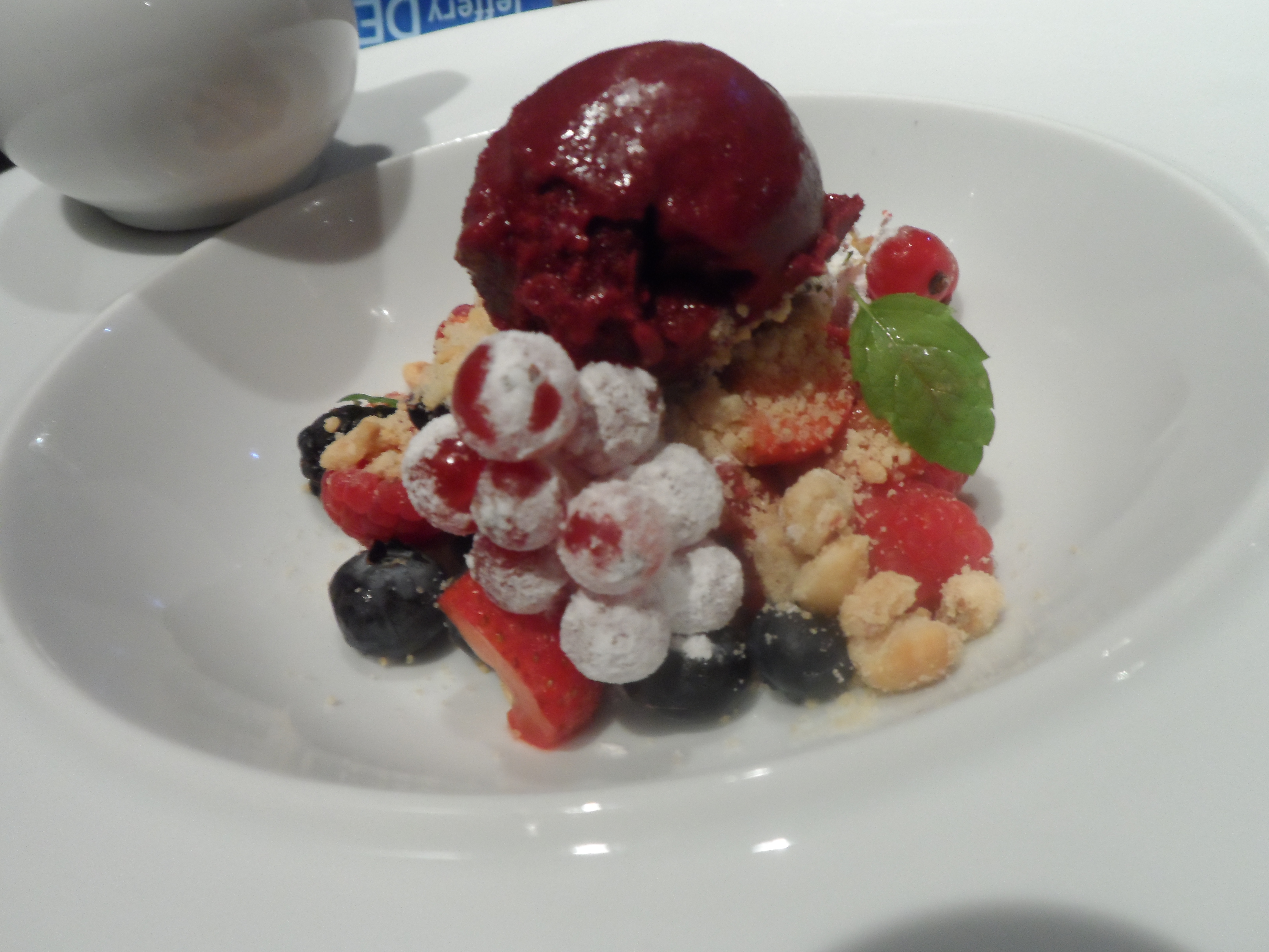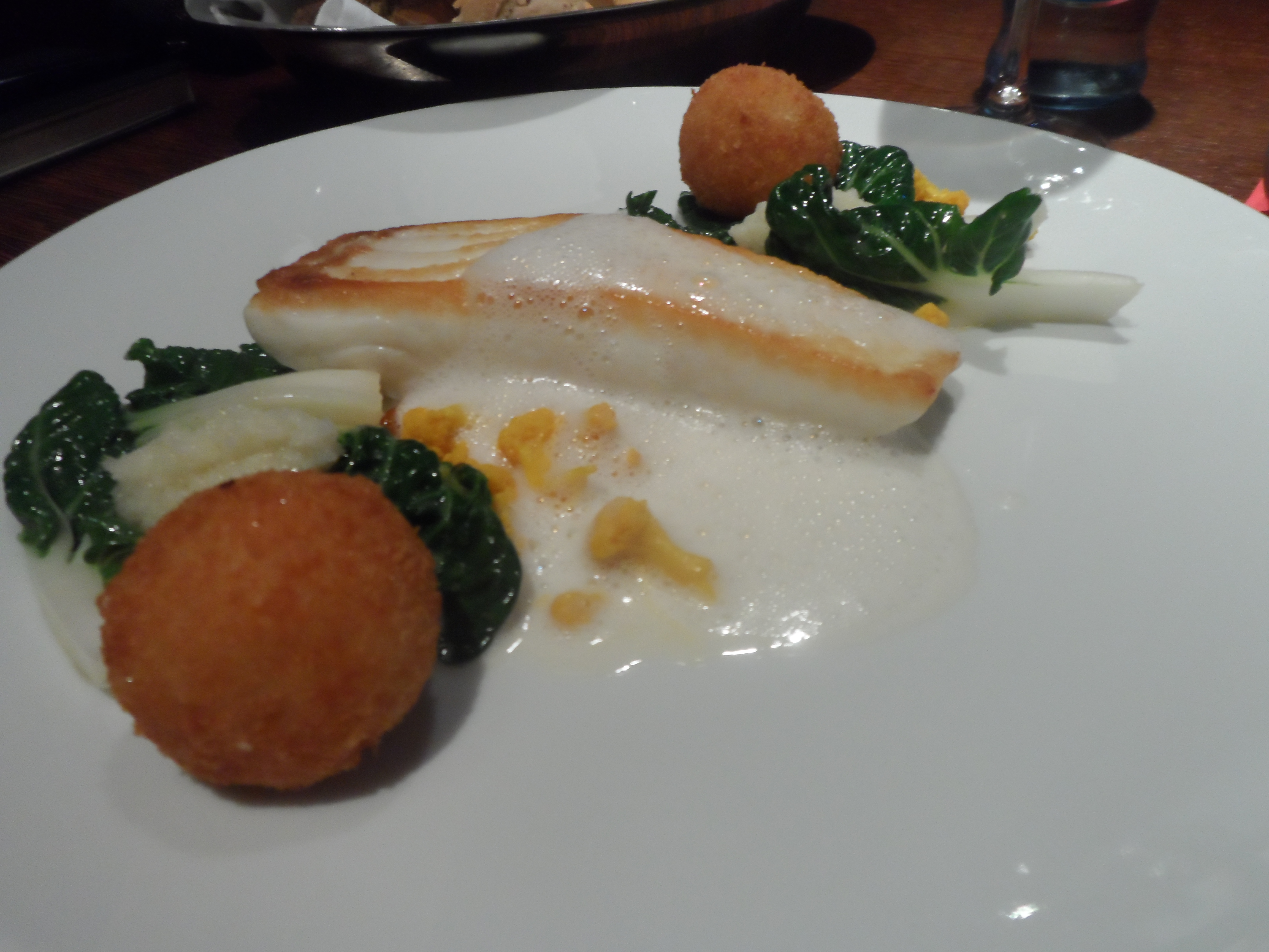 Amuse, crab cake and saffron and lemon-grass mousse – Halibut with red curry gel, coconut and jasmine foam, marinated and pickled cauliflower, paksoi and rice croquet – summer berries with creme Anglaise roasted hazelnut and almond crumble