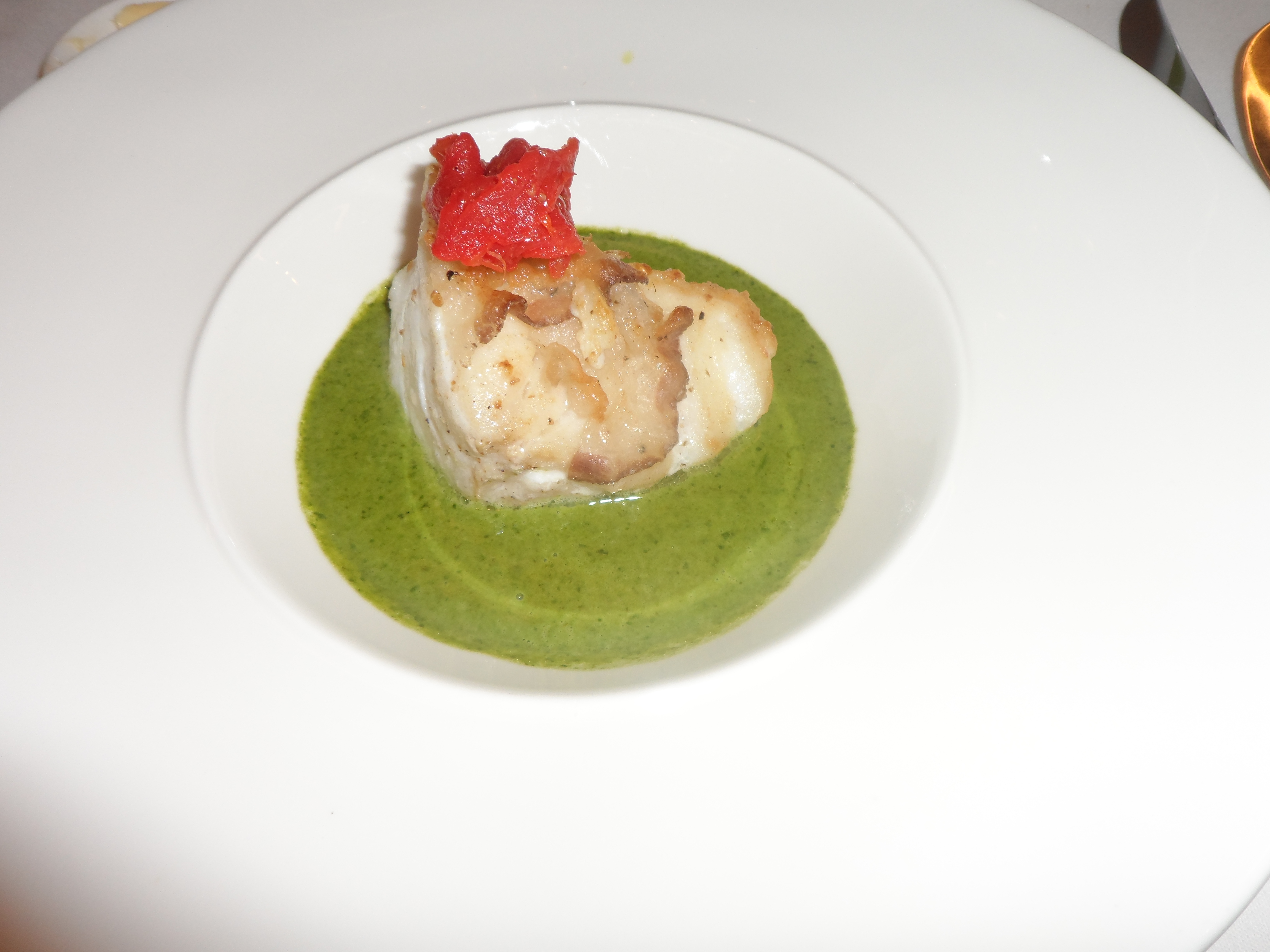 Luckily it was followed by a marvelous cod fish in a ‘coulis’ of watercress, with a little candied tomato. Good in taste perfectly prepared, maybe just to much butter in the sauce….