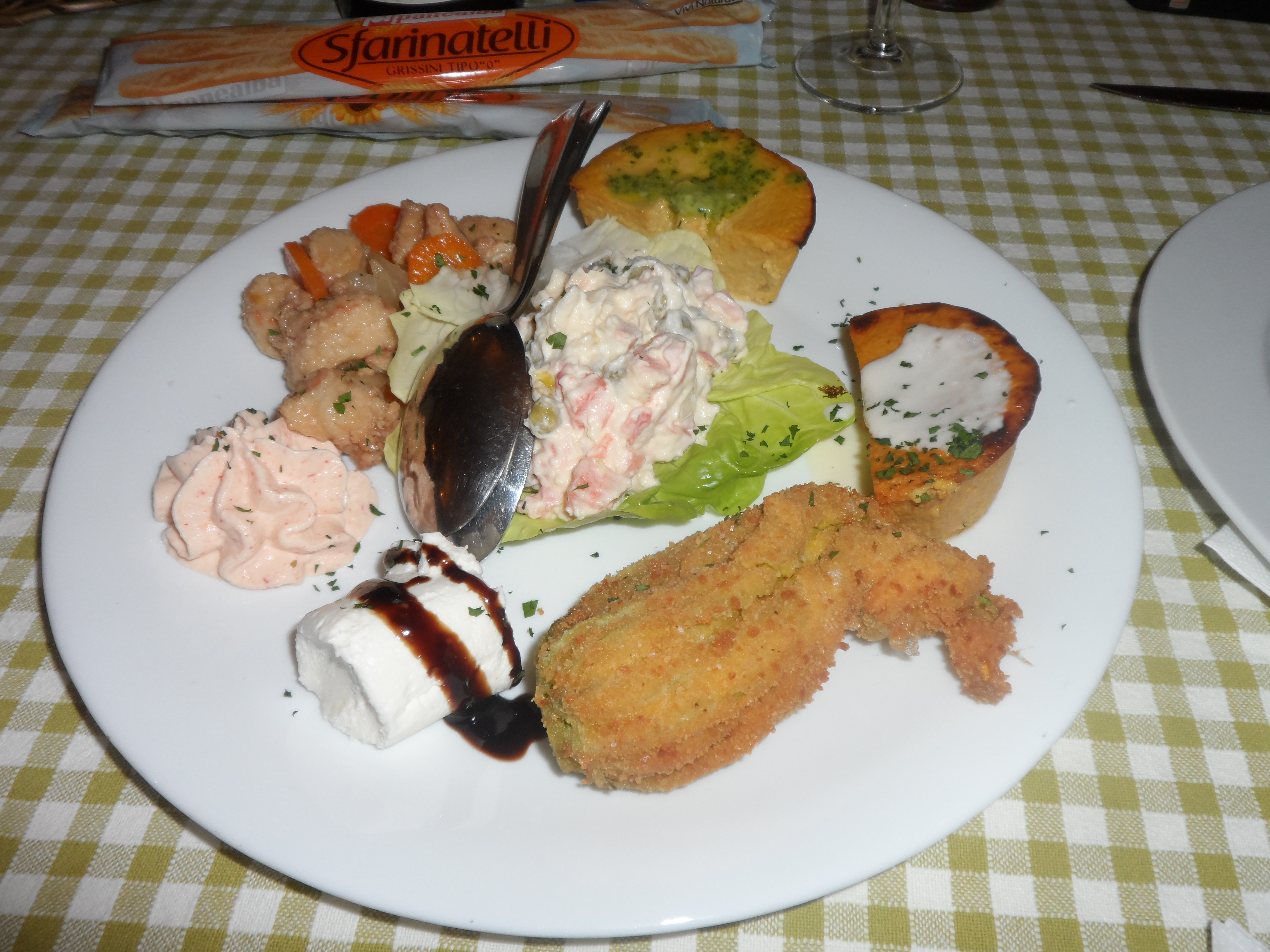 Tagliata con crema gorgonzola (beef with blue cheese sauce), pansoti con salsa di nocci (pasta with walnut sauce) as a main course, we started of course with some traditional antipasti !!! containing zucchini flowers, goats cheese, insalata and potato quiche.