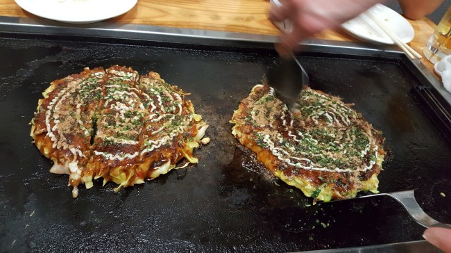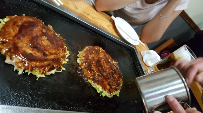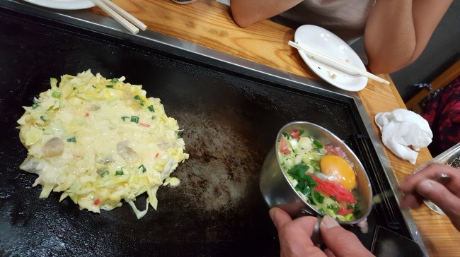 But after this, and some local beer, having a small jetlag, finally 2 great dishes: Pork and vegetable dim sum on the hot plate, and after this fresh made veggie and chicken and veggie and shrimp “frittata”. Topped with fresh sesame soy sauce and typical Kewpi mayonnaise…