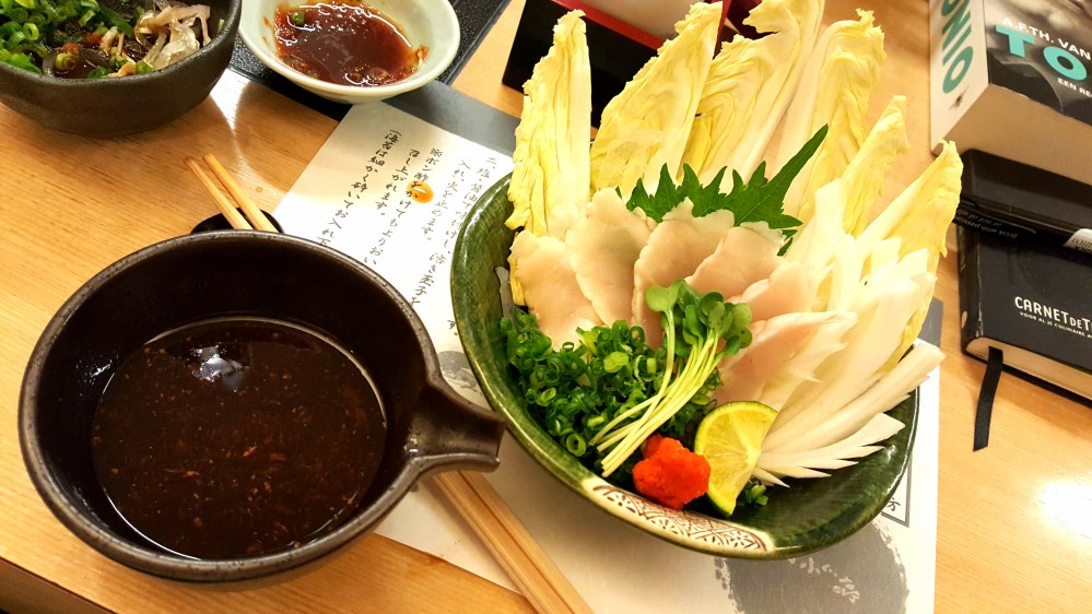 - Raw blowfish (Fugu sashimi) Which was very boring to be honest… a very tough and even chewy type of fish which in my opinion only was good because of the soy sauce…
