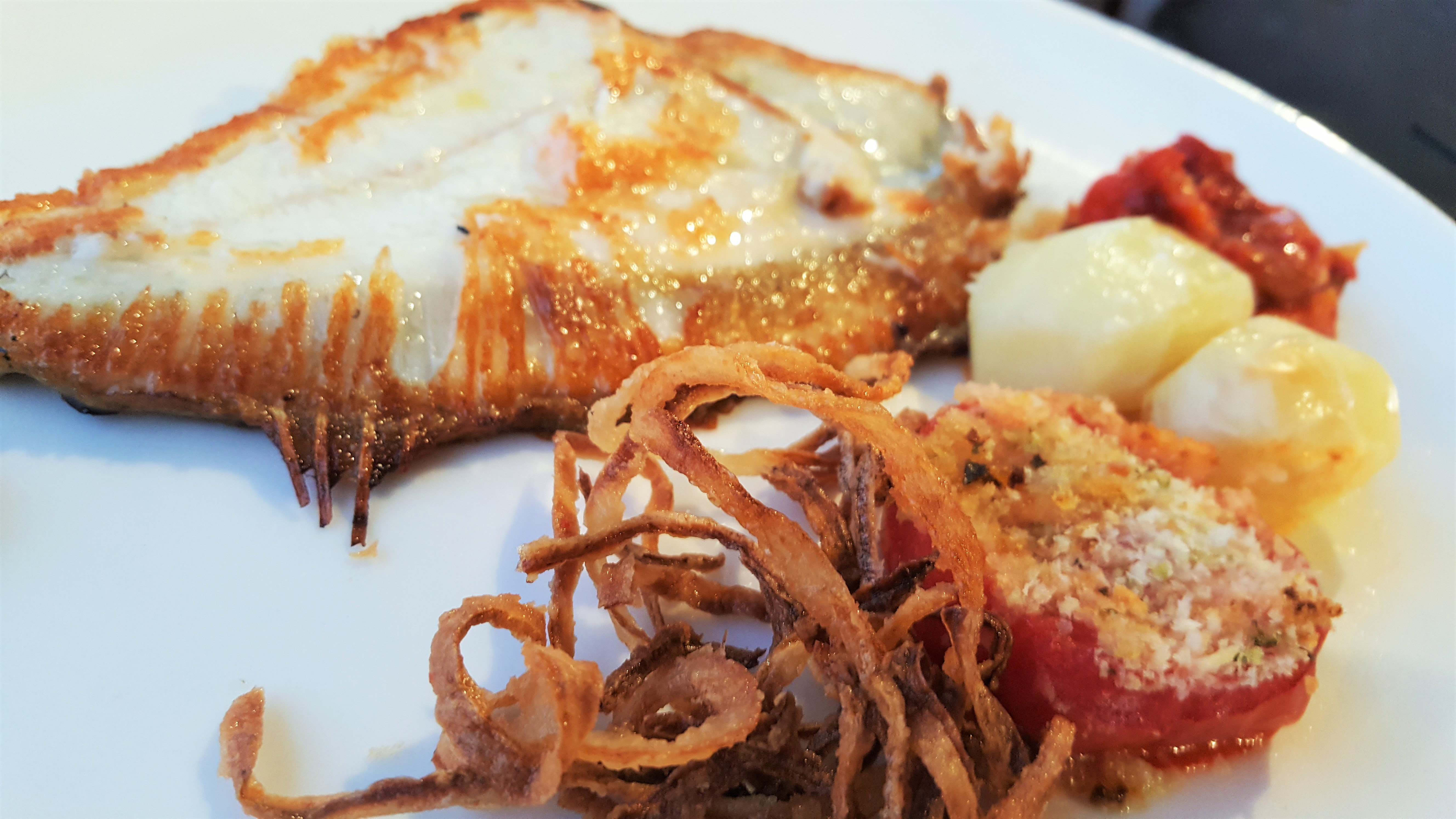 Baked turbot with young garlic and tomatoes (Rodaballo a la plancha), perfect fish, great condiments, good dish.