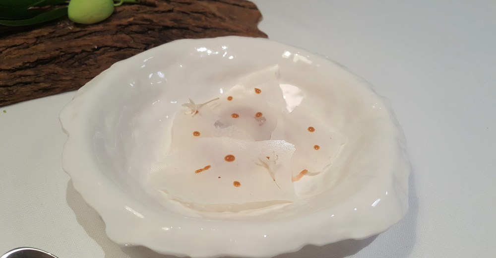Dried seaweed crackling (see above picture) with an espuma of Dashi. Great presentation! light simple starter