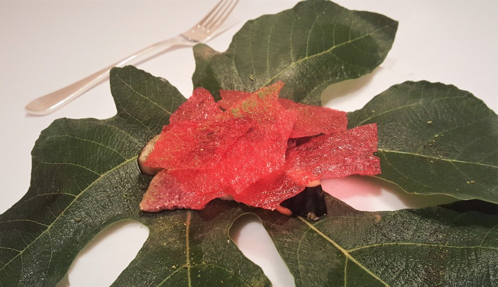 Dessert time! Fig tree powder?! with figs and candy shards on top, lovely presentation on a fig tree leaf.