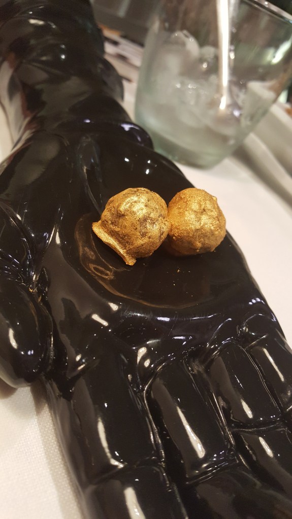Coffee time with snacks and bites, nothing really special, quite standard even. Some gold choc in a black hand….haha