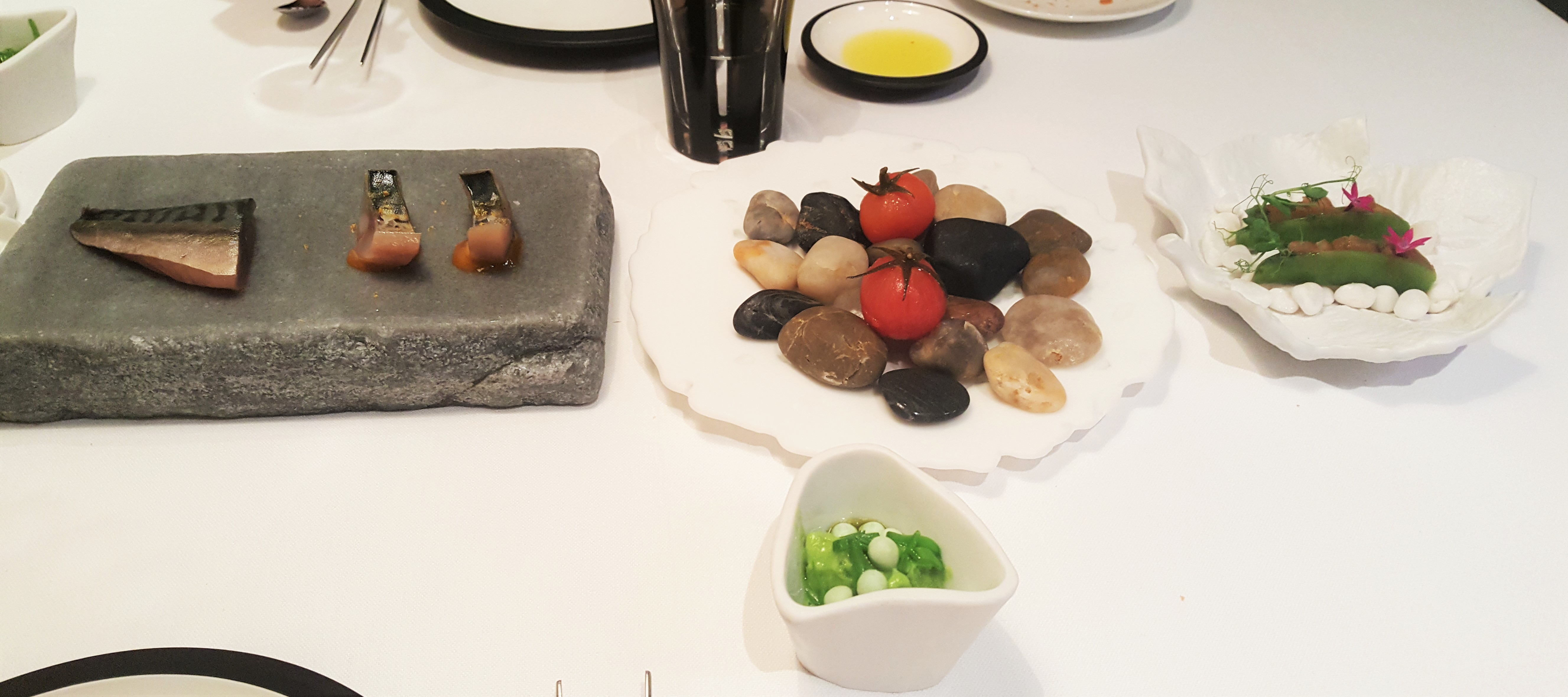 Followed by more starters out of the menu… marinated and raw Mackerel with orange. a pickled cold cherry tomato, garden peas with avocado, a green lime and basil curry with frozen taste bombs on top….