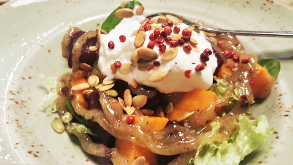 Another tasty sweet&sour salad, with sweet pumpkin and pumkin seeds…. just that damn pink pepper… leave that part out please! because it will ruin all dishes that follow…