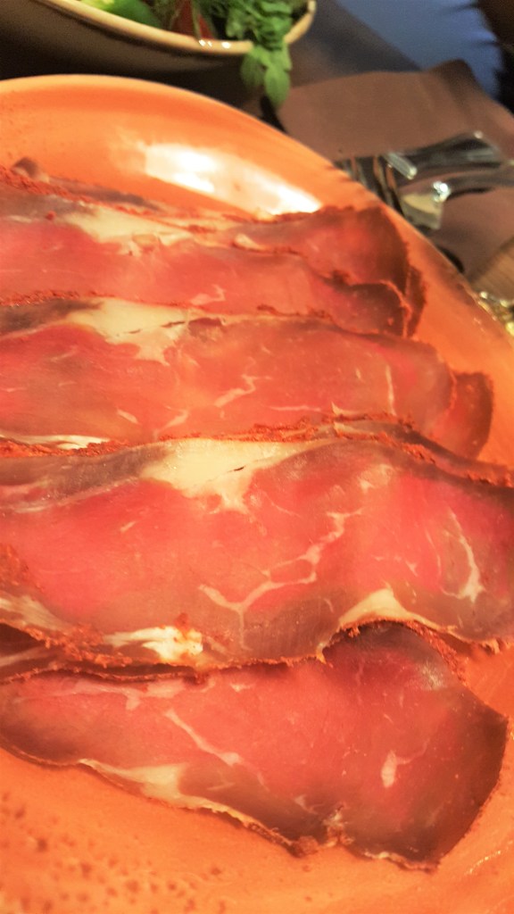 Dry aged beef with a bell pepper and paprika powdered crust. Cured the way it should be, rich meaty flavours, always a winner!