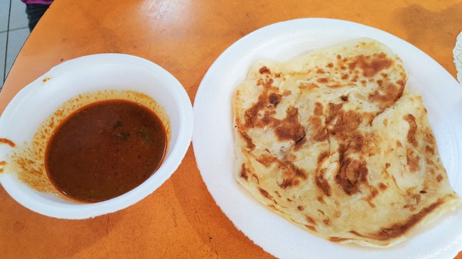 Also from this foodstand some typical Malay dish made out of yellow noodles, egg, peanut gravy and sweet potato. NJAM, this is my kind of food! And while we are here, let us do some Roti with flat bread and some fish curry! Great breakfast….. so full already, just 24 more to go…. thanks Dani…. hahaha
