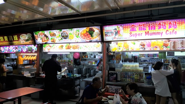 So we crossed the street to go to some real local Chinese food stands at the Hawker market over there. Dani knew some places such as the Super Mommy café, who ownes 4 of the stands next to each other, with the whole family working there…