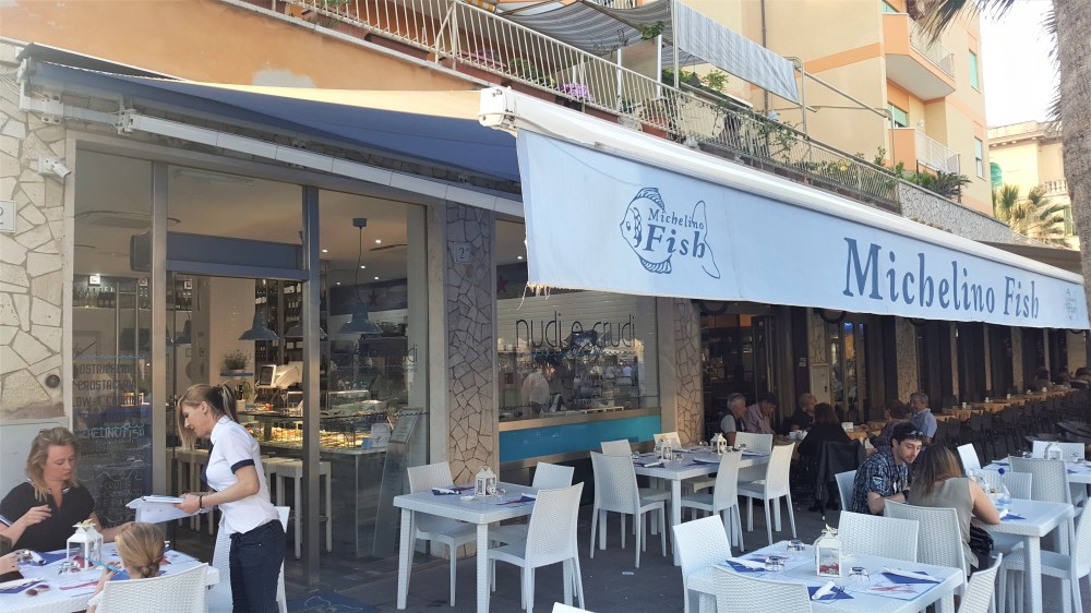 So a fish and seafood restaurant it is. Looking at both in and outside, this cannot go wrong I guess. Close to the beach, close to Rome, beautiful boardwalk as well as a nice and cosy Piazza. And what I like most and always prefer in a fish restaurant, they only serve fish….. which sounds logical I know. But in real life nowadays, especially in Western Europe, they sell some fish but to keep all table guest happy also some ribs and steak or something else. This is the main reason I love Italy, they often stay authentic, so fish means fish or mussels or clams, but nothing else!