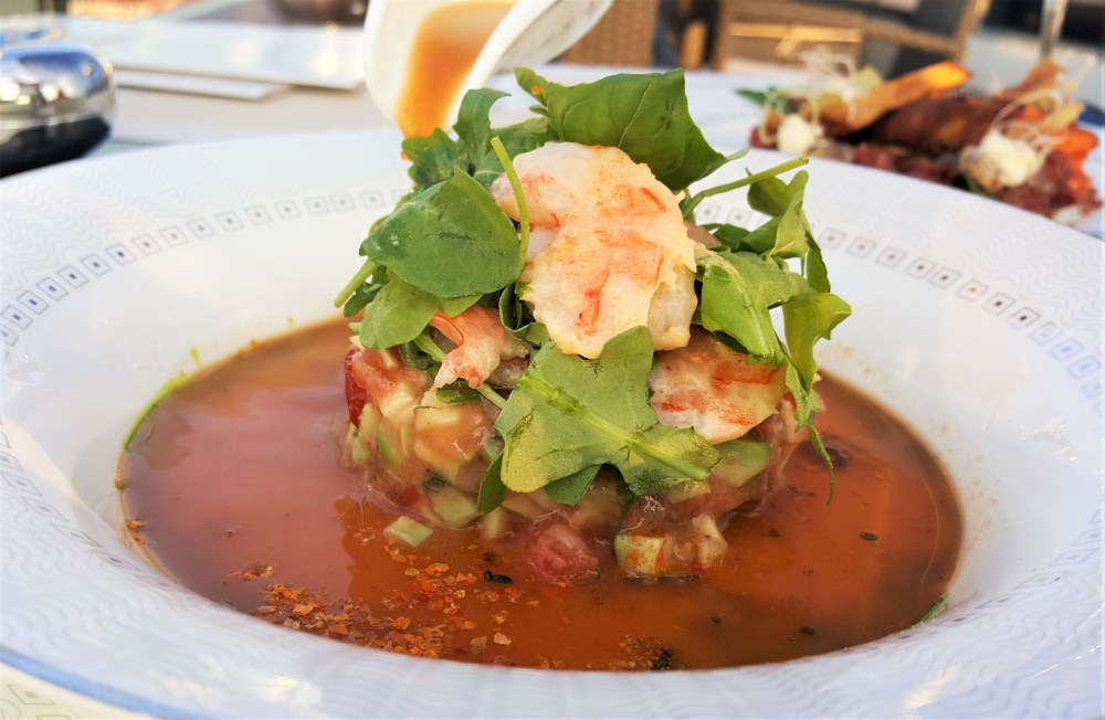 Which was light and refreshing on this hot day; Avocado tartar with shrimps and…. an amazing Gazpacho. Better than I ever had in Spain… and this combination was new to me, but perfect seasoning. Poured out at the table, very simple but very good. Less is more….
