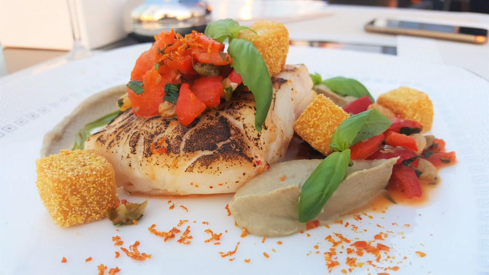 Oriental style cod, with raisins (???) and sweet peppers and a mash of eggplant. First the “cuisson” or quality of baking was impeccable! flaky and soft, perfection. peppers and raisins, strange combo but it kind of worked in this case… Eggplant puree was not needed and too heavy…. but WTF are these strange cubes? I still do not know exactly. Some combo of Mozzarella, Gouda, Becamel, cornstarch, sesame, all things together in a cube. Was that any good? NO! But it looks nice on the plate, doesn’t it?