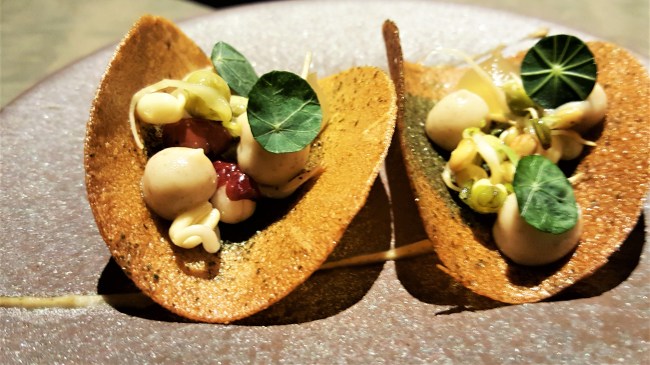 Taco’s of Jerusalem artichoke with pickled peas cream, or buck-thorn foam, mini lentils and sepia “cake”.
