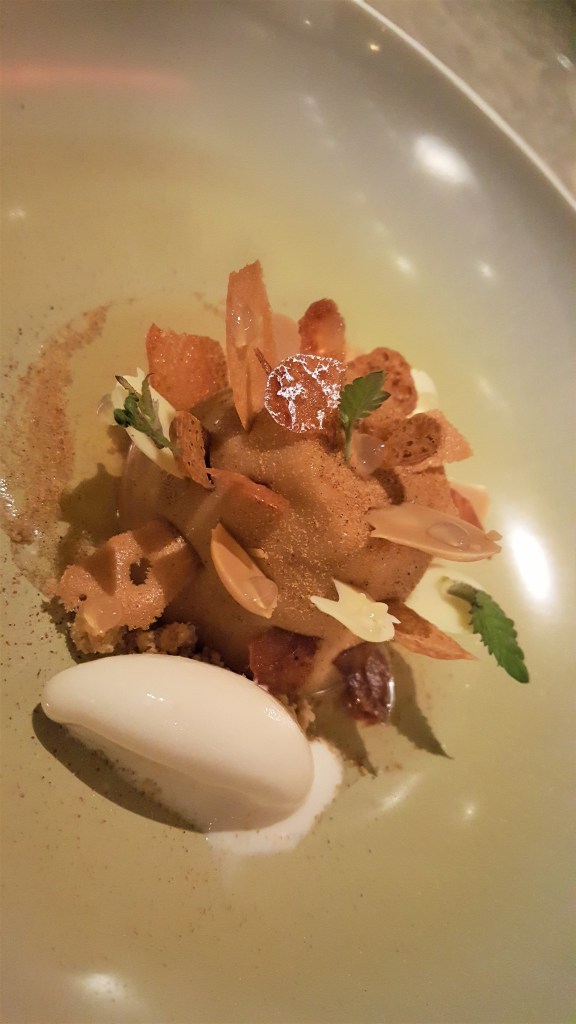 Salted milk ice-cream, that is a first! With pine tree extract, pear and honey. Very sweet, almost too sweet, but the milk ice did its work.