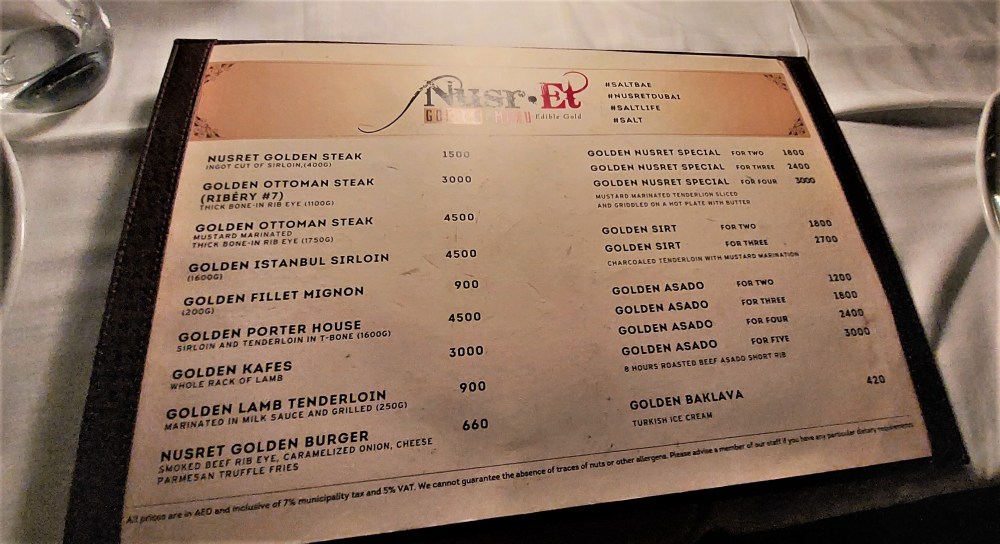 And the Baklava is a real bargain, only $100 a piece. I think his Turkish grandparents are turning in their graves, as the Turkish baklava normally costs a bit less. But it is not crazy he asks these prizes in my opinion. What is crazy is that people actually pay for this bullshit! On the other hand…. You do get a sprinkle of real salt, thrown by some 19 year old student on his own elbow, onto you steak. What a treat, never seen that before, and the way they cut that meat, wow! Worth every penny (NOT).